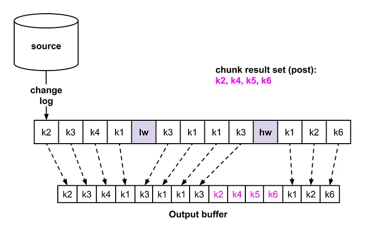 个人认为 这其实是一个 滑动窗口的设计算法,使用在原始的数据源中打桩生成2个高低水位作为滑动窗口的思路非常的巧妙, 但是我认为这个时候应该就不可以并行的 应用 Chunk 了吧,应该不能了吧,这个不确定, 当然应用变更那部分确实存在可以 异步的可能性,所以还是能部分并行的, 并行有全局有序的 seq 顺序