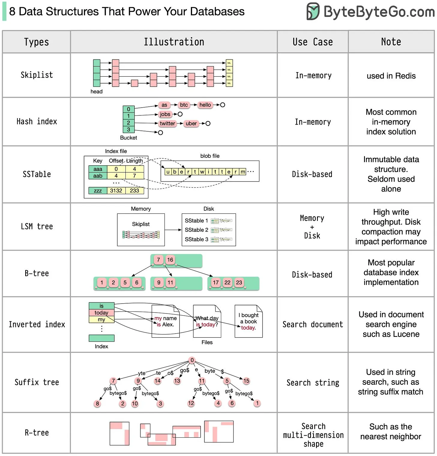 • B-tree : Disk-Based Solution. Mysql 的 B+ Tree 索引, MongoDb 的 B Tree 索引 都是其中的 佼佼者, 而且不仅仅是 磁盘,好像 etcd 同时使用了一个开源的 B+ tree 树磁盘存储 和 Google 的内存 B+ Tree 树 ;